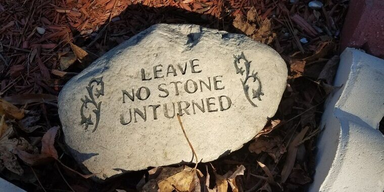 It urges exhaustive searching or thorough effort, as if flipping every stone to find a hidden object.